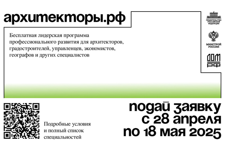 ДОМ.РФ объявляет о начале отборочного этапа на седьмой поток Архитекторы.рф. Программа профессионального развития реализуется ДОМ.РФ при поддержке Минстроя и Правительства России в рамках нацпроекта «Инфраструктура для жизни». Прием заявок продлится до 18 мая включительно.
