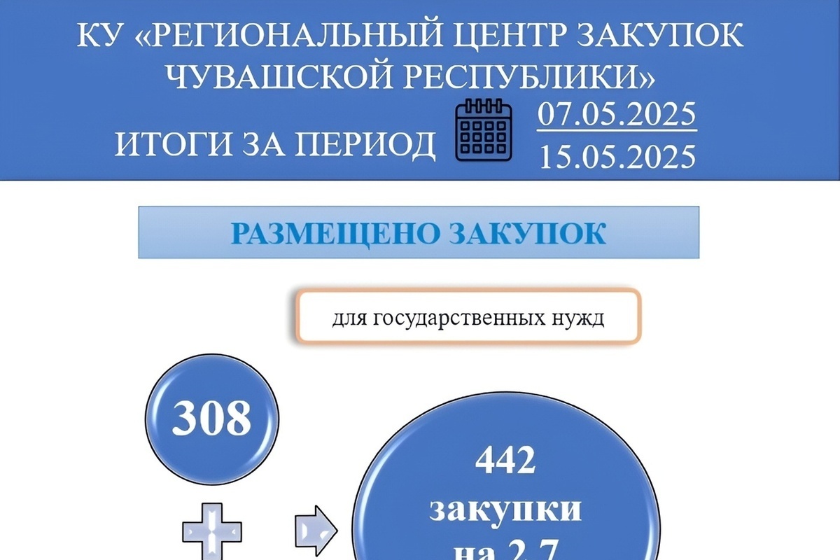 Региональный центр закупок Чувашской Республики подвёл итоги недели: с 6 по 12 мая было объявлено 442 закупки на общую сумму 2,7 млрд рублей. Из них 308 предназначены для государственных нужд, 134 — для муниципальных.