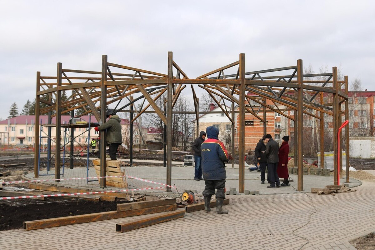 В Цивильске работа идет одновременно на нескольких участках. Строители собирают металлоконструкции будущего амфитеатра, стационарной сцены и просторного навеса. Продолжается укладка плитки, идет озеленение и установка элементов благоустройства — пространство постепенно приобретает очертания будущего городского центра притяжения.