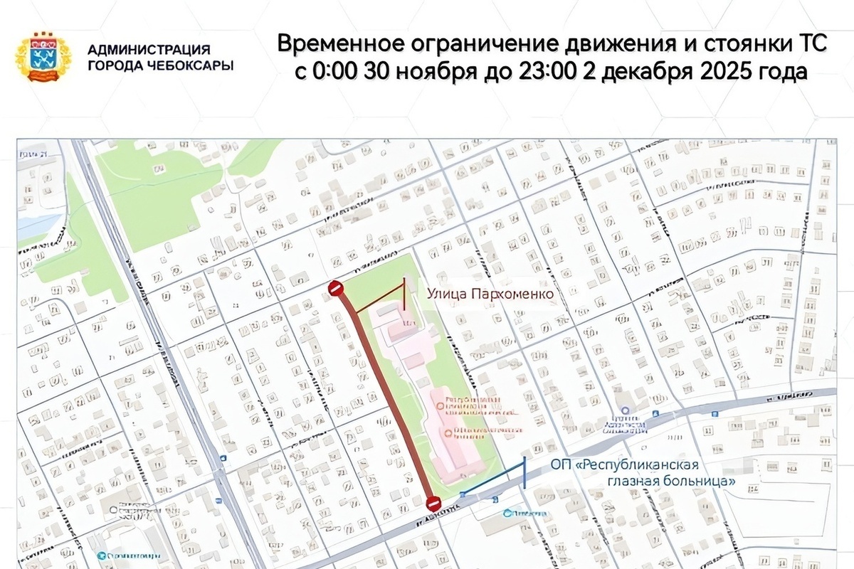 С 30 ноября и до 23:00 2 декабря на улице Пархоменко в Чебоксарах будет ограничено движение транспорта. Причина — устройство нового дорожного покрытия.