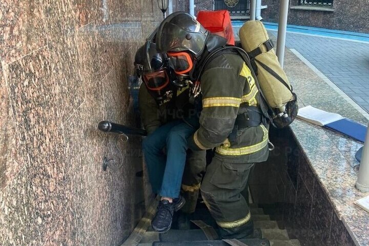 Спасатели отработали действия по ликвидации условного возгорания и спасению людей из здания.
