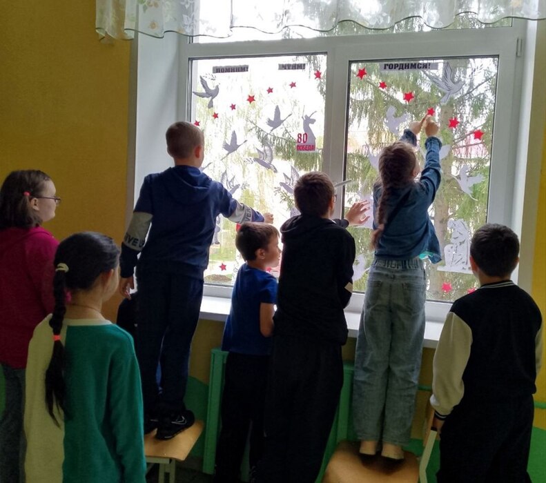 В числе первых рисунки, посвященные 9 мая, вырезанные по трафаретам тематические изображения и символы Победы появились на окнах образовательных учреждений региона. Так, в госпаблике Первомайской школы Батыревского округа отметили, что стёкла в классах украшали педагоги, учащиеся и активисты «Движения Первых». На окнах – изображения цветов, Вечного огня, голубей мира, журавлей. На создание торжественной атмосферы в учебном заведении ушло несколько дней. «Мы стремимся передать важность и значимость тех событий, и именно такие акции помогают нам объединиться в стремлении сохранить память о тех, кто отстоял нашу свободу», – подчеркнули активисты Первомайской школы.