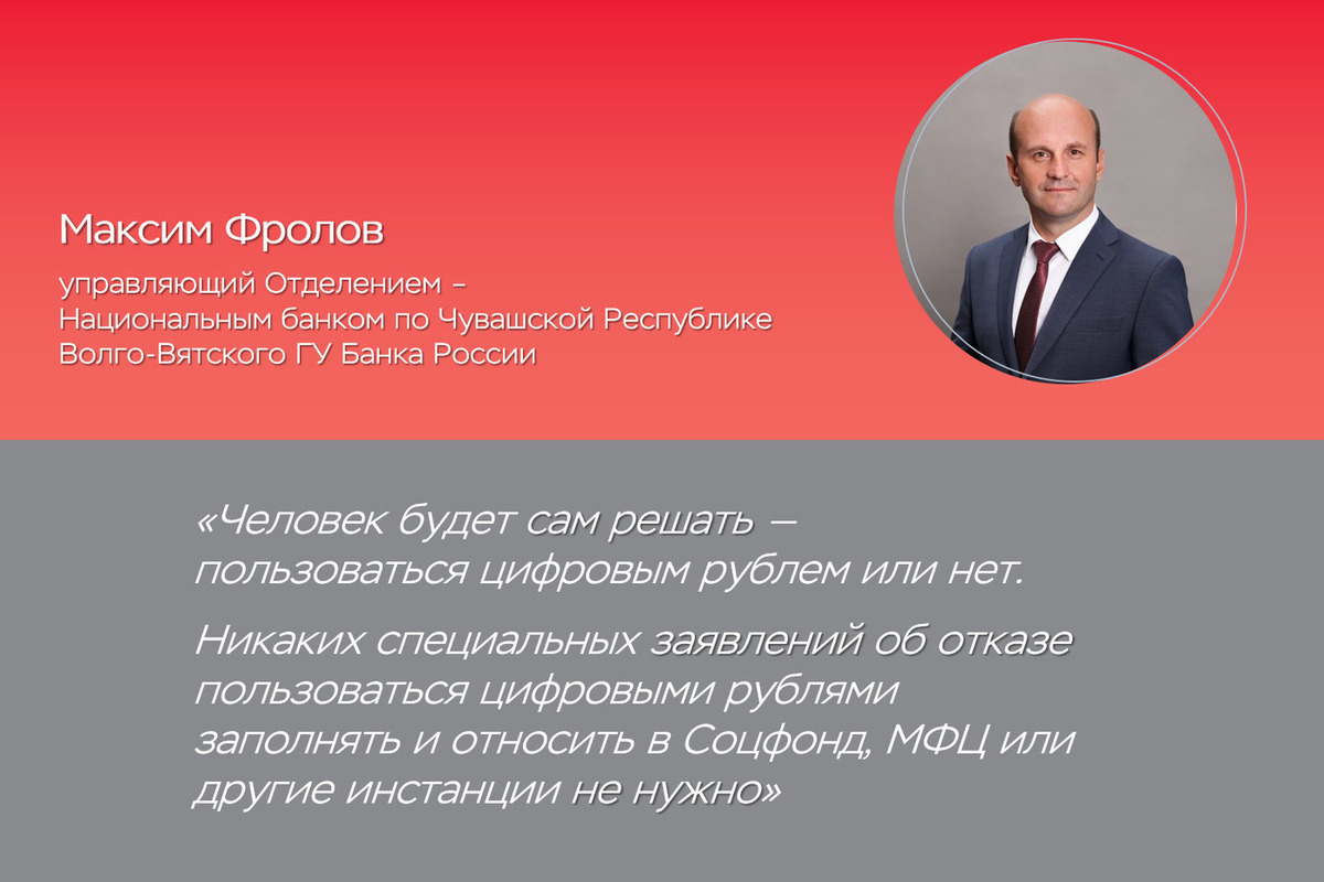 «Человек будет сам решать — пользоваться цифровыми рублями или нет. Они не заменят привычные наличные и безналичные деньги. Можно просто не открывать цифровой кошелек, если человек не хочет использовать цифровой рубль. Это добровольный выбор. Никаких специальных заявлений об отказе заполнять и относить в Соцфонд, МФЦ или другие инстанции не нужно. К открытию счетов цифрового рубля они не имеют никакого отношения», — пояснил управляющий Отделением-Национальным банком по Чувашии Максим Фролов.