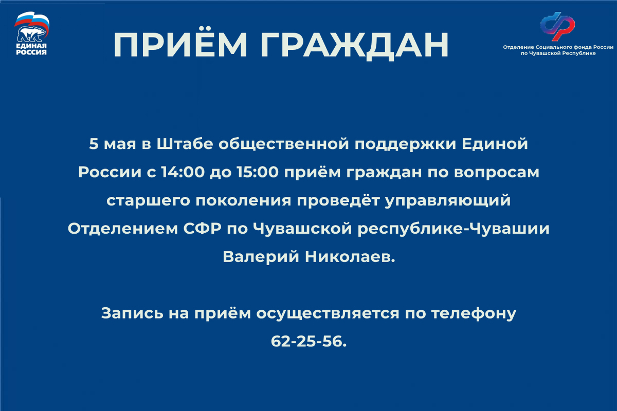 5 мая в штабе общественной поддержки Единой России с 14:00 до 15:00 прием граждан по вопросам старшего поколения проведет управляющий отделением Социального фонда России по Чувашской Республике Валерий Николаев.