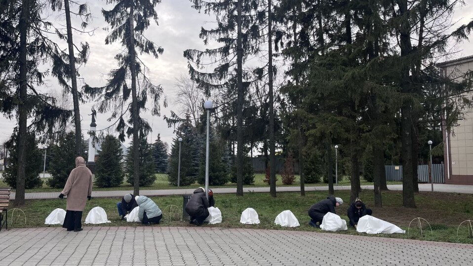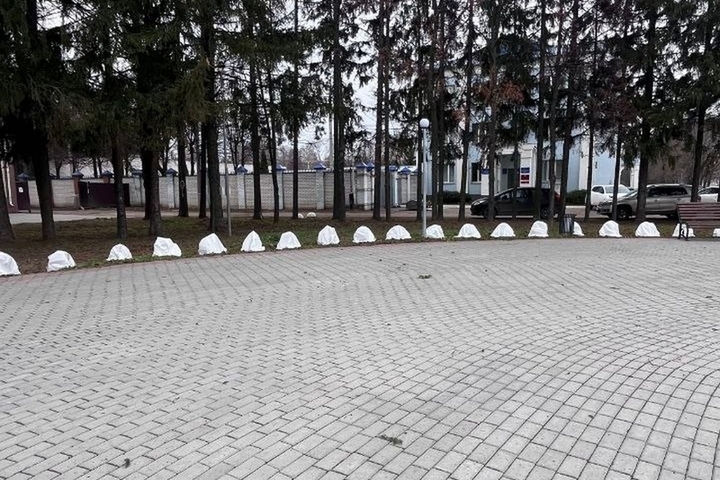 Сотрудники администрации округа выполнили обрезку и укрыли цветочные кусты специальными материалами, чтобы защитить их от морозов.
